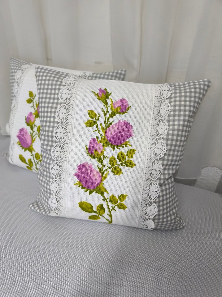 Pembe nakışlı güllerin yer aldığı beyaz orta panel, gri kareli kumaş ve dantel kenarlarla çevrili geleneksel tarzda yastık kılıfı. 40*40 ölçülerinde üretilmiştir. Nakış ve dantelleri el emeğidir. Leke tutmaz özelliği ile uzun ömürlü, şık ve rahat bir kullanım sağlar.