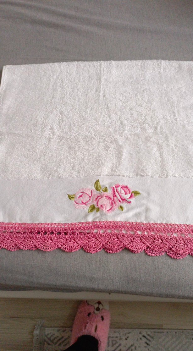 Bu havlu, yumuşak pastel pembe gül nakışı ve uyumlu tığ işi kenarı ile zarif bir dokunuş sunar.