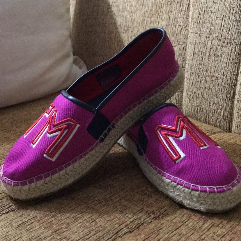 Pembe tekstil espadriller, dolgulu topuklu, renkli nakış detaylı ve cırt cırtlı kapamalı, trendi gündelik şıklık için. TM markası bulunur. Orjinal kutu ile gönderilir
