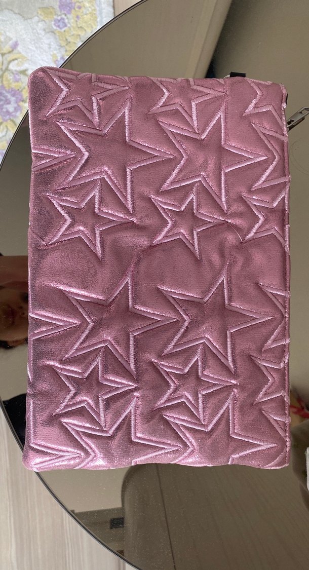 Pembe, parlak sentetik kumaştan, nakışlı yıldız desenli ve fermuarlı kadın el çantası, günlük kullanım için uygundur.✨