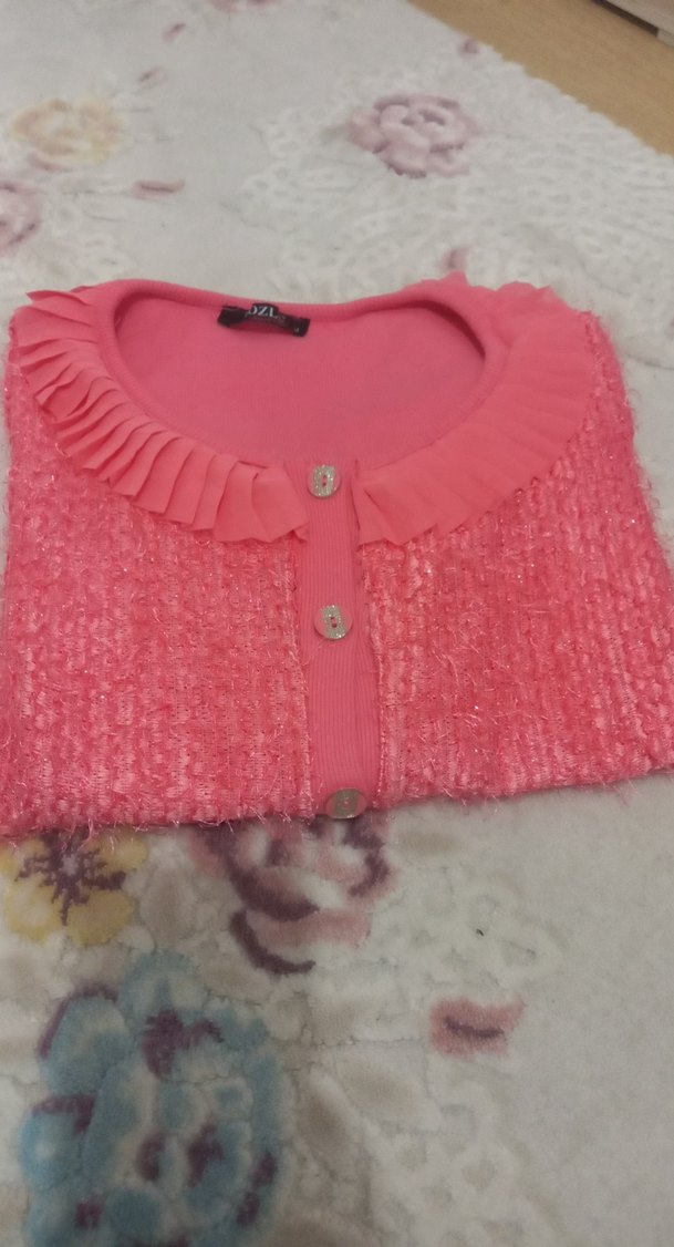 Pembe renkli, nakış işlemeli, uzun kollu ve bol kesim kadin hırka fırfırlı yaka ve düğmeli ön tasarım, street wear tarzında.