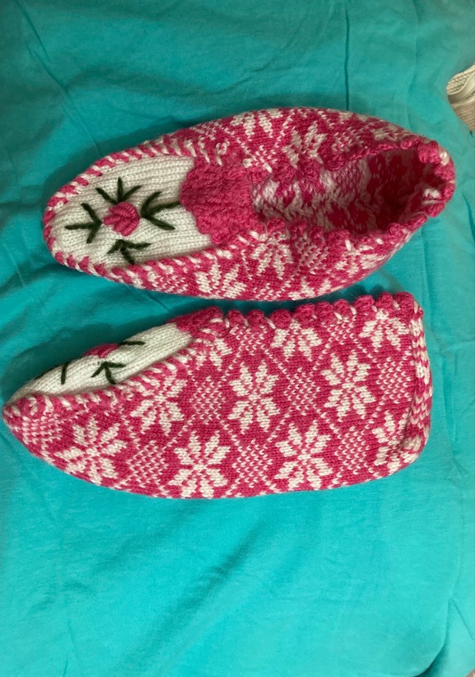 Pembe örgü kadın terlikleri, renkli nakışlı çiçek desenleri ve yumuşak, sıcak kumaş sunar. Bohem tarzda klasik modeldir.