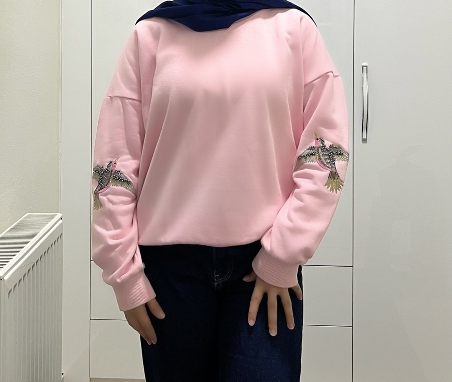 Pembe pastel tonlarda, nakışlı ve payetli kuş desenleriyle süslenmiş, uzun kollu, yuvarlak yakalı, bol kesim kadın sweatshirtü. Rahat ve sıcak kumaştan üretilmiştir. ️