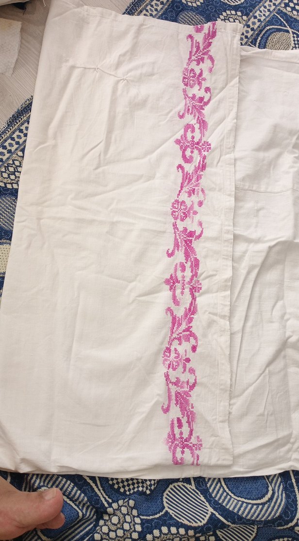 Beyaz kumaş üzerinde pembe çiçek desenli dikey nakış işçiliği, geleneksel el sanatları tarzında.