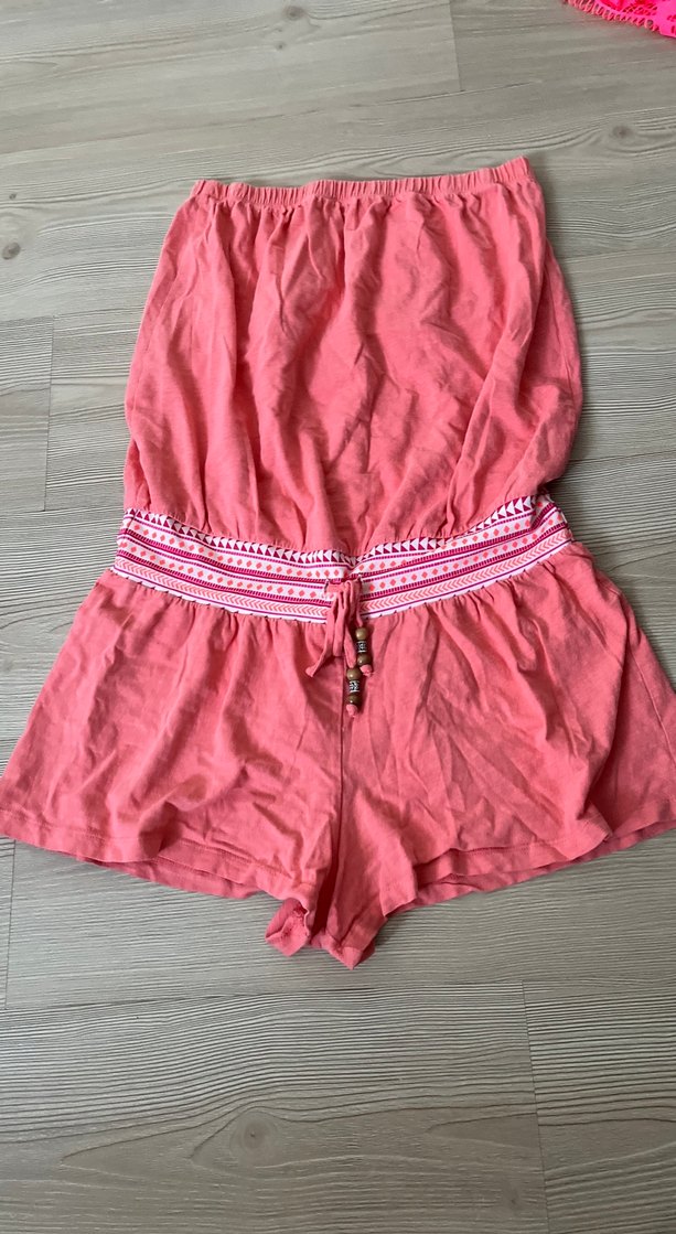 Pembe renkli, nakış detaylı, kemerli ve straplez kesim bohem stil kısa tulum. Salaş kesimi ve kolsuz yapısıyla dış mekan kullanımı için uygundur.