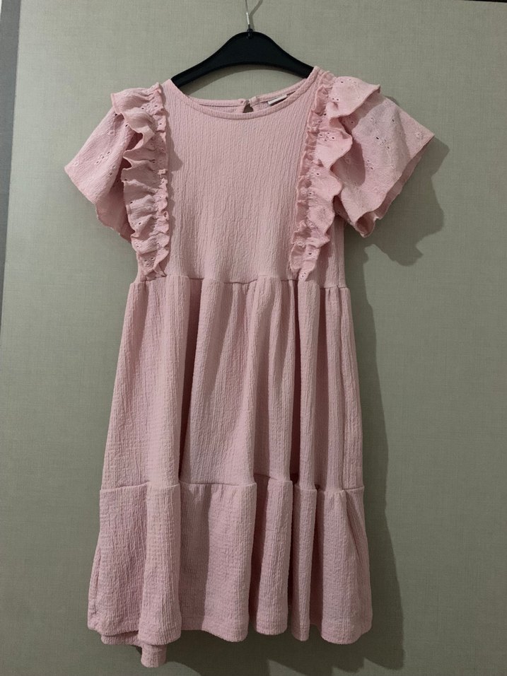 Keten kumaştan, kısa kollu ve yuvarlak yaka kız elbisesi. Nakışlı detaylar ve fırfırlar bohem tarz sunar.