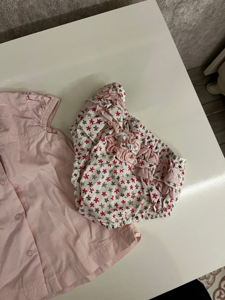 Pastel pembe kısa kollu üst ve nakışlı, fırfırlı bloomer içeren bebek kız takımı, rahatlık ve şıklığı bir arada sunar.