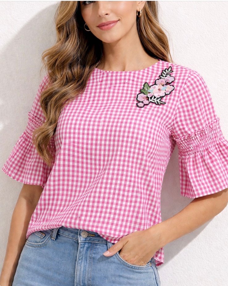 Pembe Nakışlı Kısa Kollu Kadın Bluz