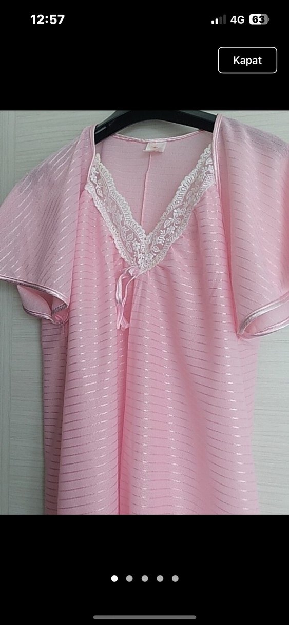 Rahat kesimli kadın gecelik, kısa kollu ve midi boydadır. Pastel pembe renkte, nakış detaylı ve dantel yakalıdır.
