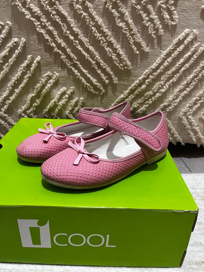 Pembe nakışlı ve fiyonk detaylı kız babet ayakkabılar, lastik malzemeden yapılmıştır. Klasik tarzda, kolay giyilen cırt cırtlı bantlıdır.