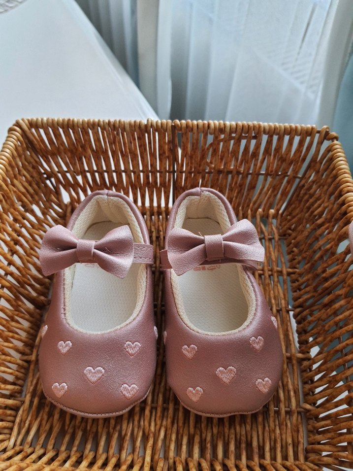 Hiç Kullanılmadı. Nakışlı kalp desenli, fiyonk detaylı pembe kız bebek babet ayakkabı, rahat kauçuk malzemeden üretilmiştir. Klasik ve pastel tarzda. 18 numara