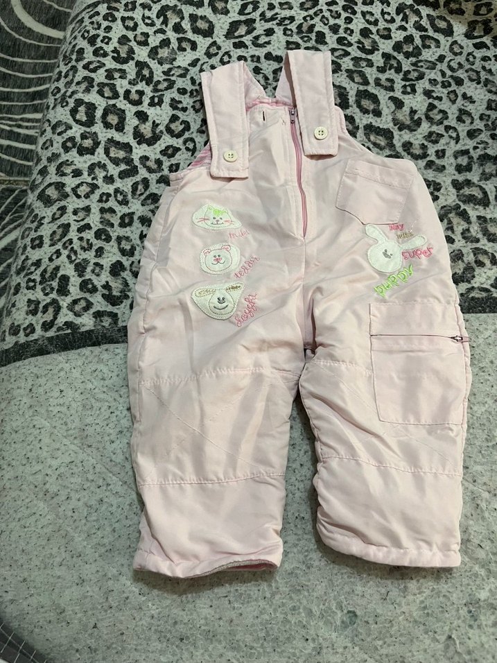 Pembe pastel renkte, nakışlı desenlere sahip straplez kız bebek kayak tulumu. Önde fermuarlı, soğuk havalar için yumuşak ve sıcak kumaş.
