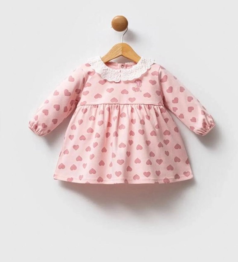 Bu gevşek kesim kız bebek elbise, uzun kollu, yakasında fırfırlı V yaka ve pastel pembe nakışlı kalp desenlerine sahiptir. Yumuşak kürk dokusundan yapılmıştır, klasik ve rahat bir şıklıktadır.
