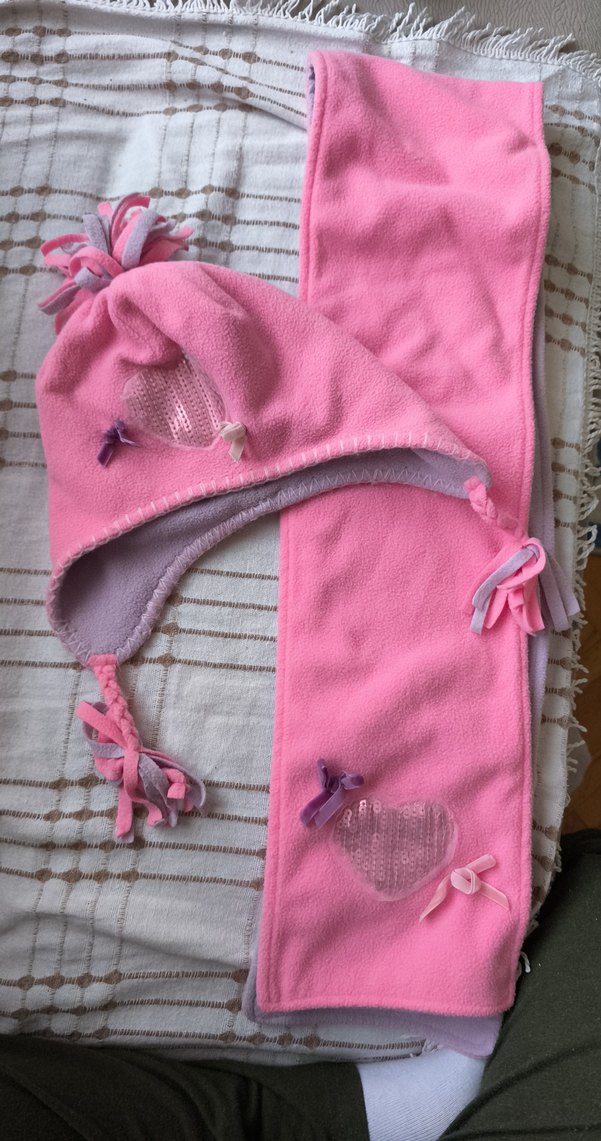 Yumuşak polar kumaştan, nakışlı kalp desenli ve küçük kurdele detaylı pembe çocuk bere ve atkı takımı.