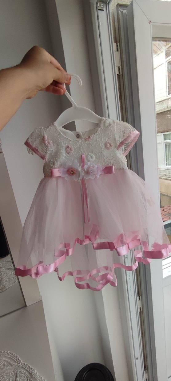 Pembe nakışlı dantel işlemeli üst kısmı ve kurdele detaylı tül etek kısmı ile klasik ve modern tarzda kız bebek elbisesi. kızıma hediye geldi olmuyor o yüzden satıyorum