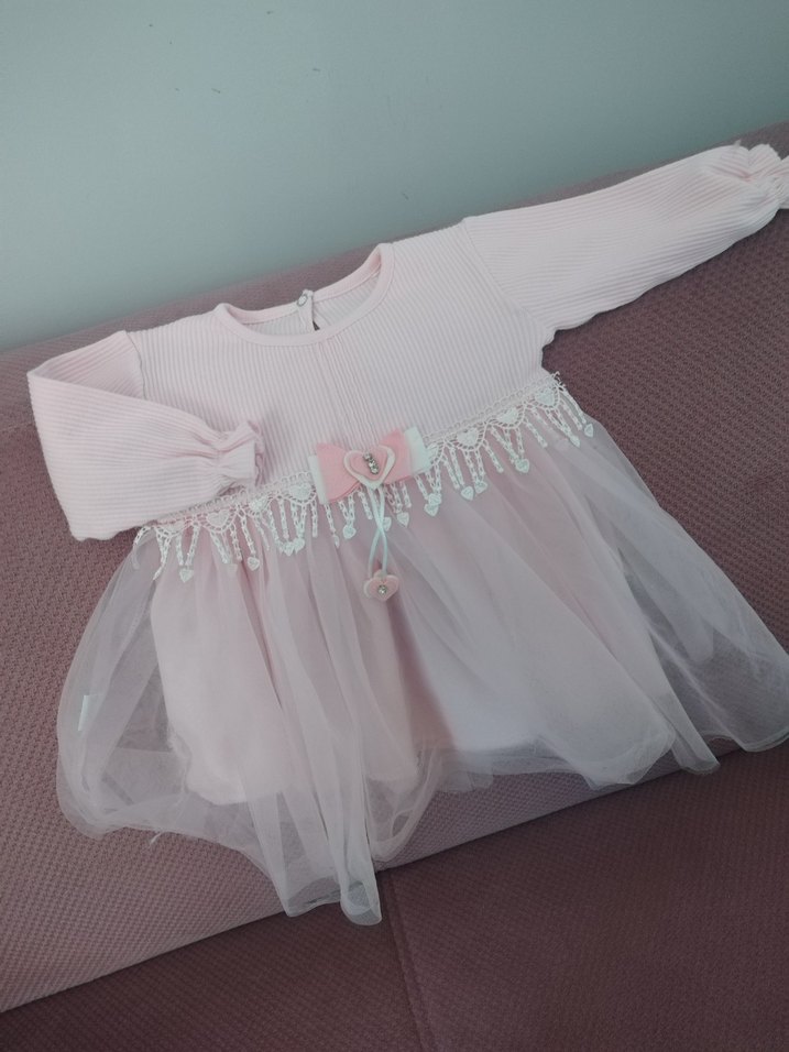 Pembe renkli, uzun kollu, bisiklet yaka ve bol kesim kız çocuk elbisesi. Triko kumaş üzerine nakışlar ve fırfırlı tül etekle modern klasik tarz sunar.