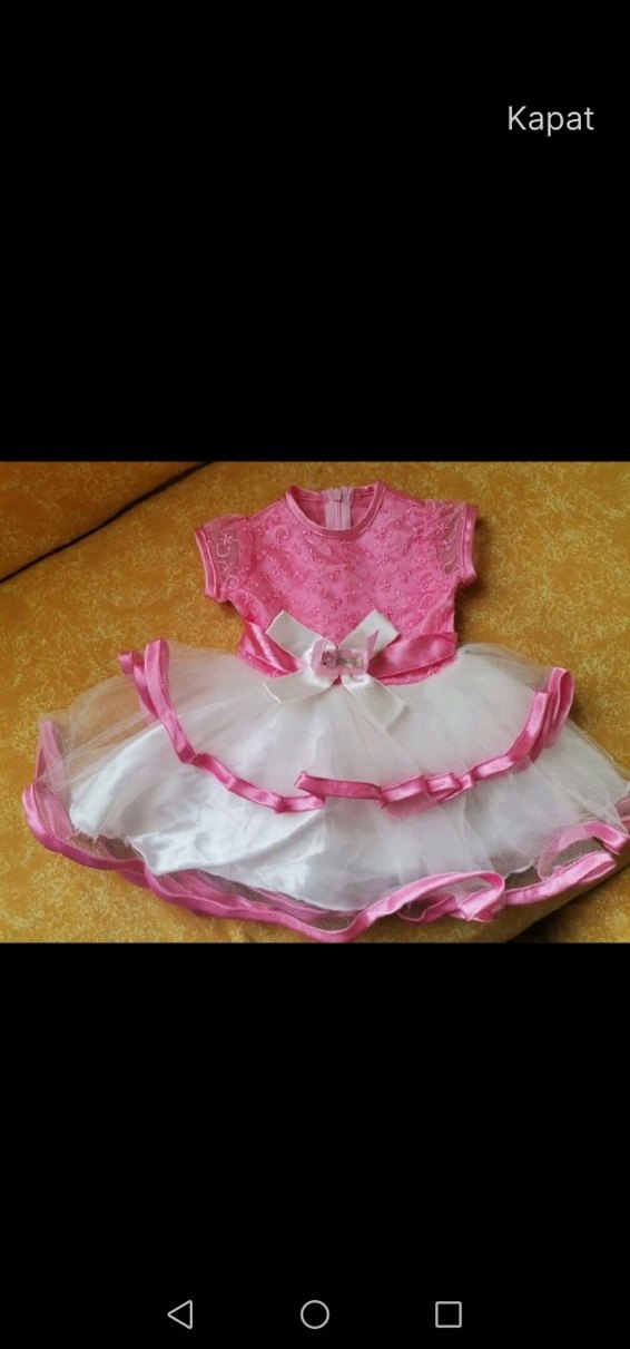 Nakış işlemeli, kolsuz pembe elbise. Straplez yaka ve beli fiyonk detaylı, etek kısmı pembe şeritli fırfırlı. Sentetik kumaştan yapılmıştır.
