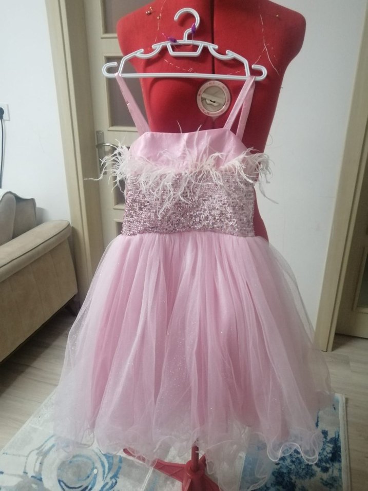 Pastel pembe renkli, nakış detaylı, askılı ve straplez yakalı, fit kesim kız çocuk elbisesi. Bohem tarzda, tül ve fırfırlı tasarım, yumuşak sentetik kumaşla üretilmiştir.