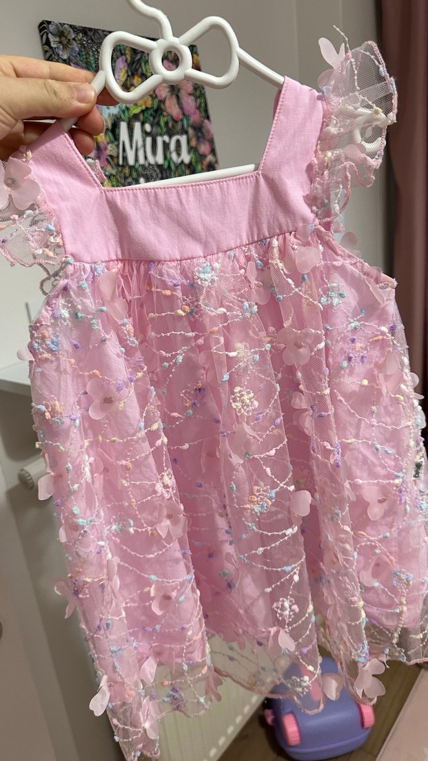 Pastel pembe renkli kız çocuk elbisesi, nakışlı ve fırfırlı detaylara sahiptir. Askılı, straplez yakalı ve bol kesimdir, bohem tarzındadır.