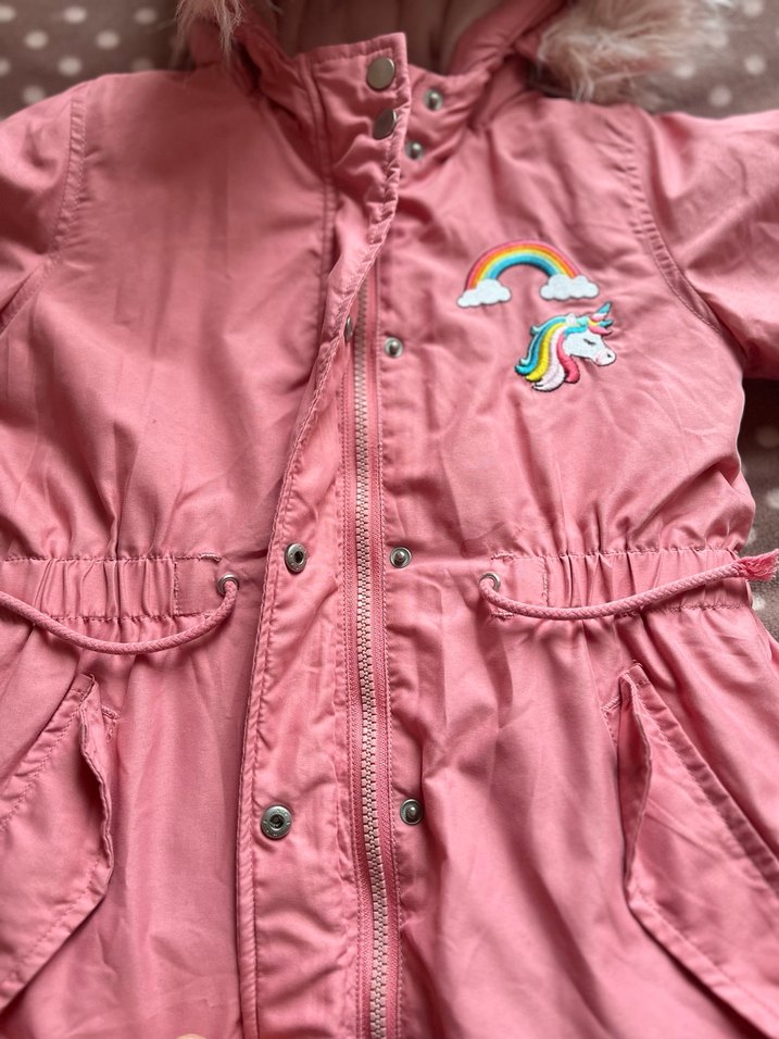 Düğmeli, pembe, nakışlı kız çocuk montu. Notlu yaka ve fitted kesim ile yumuşak, sıcak kumaştan yapılmıştır. Yırtık sökük yoktur.