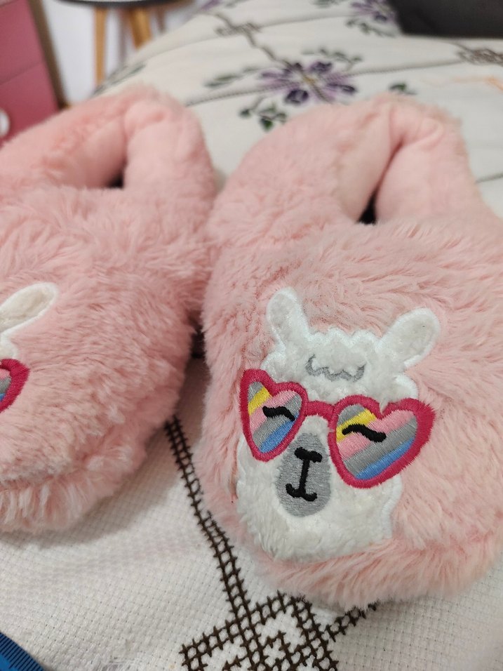 Pembe peluş kız çocuk terlikleri, kalp şeklinde güneş gözlüğü takan renkli nakışlı lama yüzü detayına sahip. Yumuşak ve sıcak, bohem ve retro tarzda. numarası yazmıyor o yüzden 30 ile 33 numaraya kadar olursa alırım görsellerde alt taban ölçüsü var