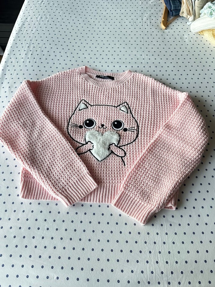 Small beden Pembe, uzun kollu, yuvarlak yakalı, nakışlı kedi figürlü, bol kesim triko kız çocuk kazak. %100 pamuk New yorker mağazasından aldım. Yurtdışından … çok az giyildi kumaşı kaliteli tüylenme yapmaz .