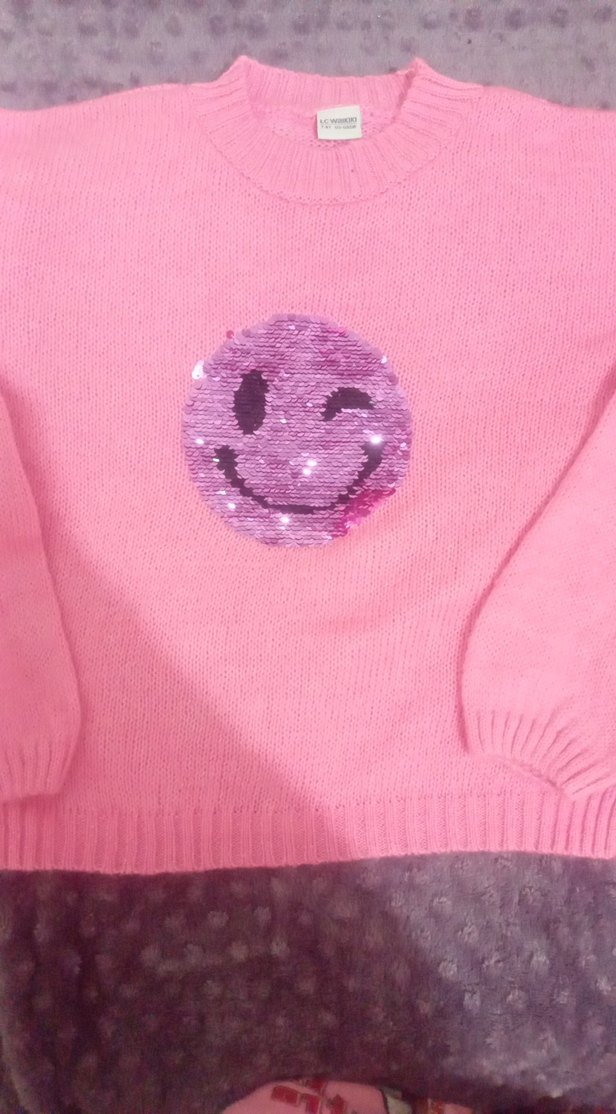 Pembe renkli, yuvarlak yaka ve uzun kollu triko kız çocuk kazağı. Önünde renkli işlemeli gülen yüz deseni bulunur.