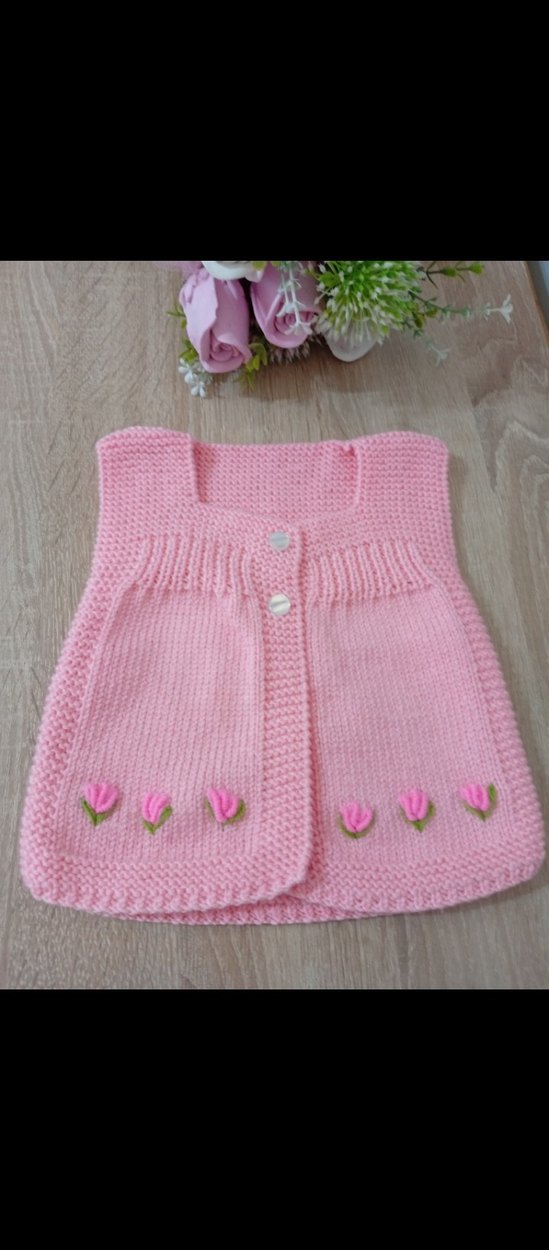 Pembe renkli, nakışlı çiçek detaylı, salaş kesim kız çocuk triko yelek, yumuşak ve bohem tarzda örülmüştür.
