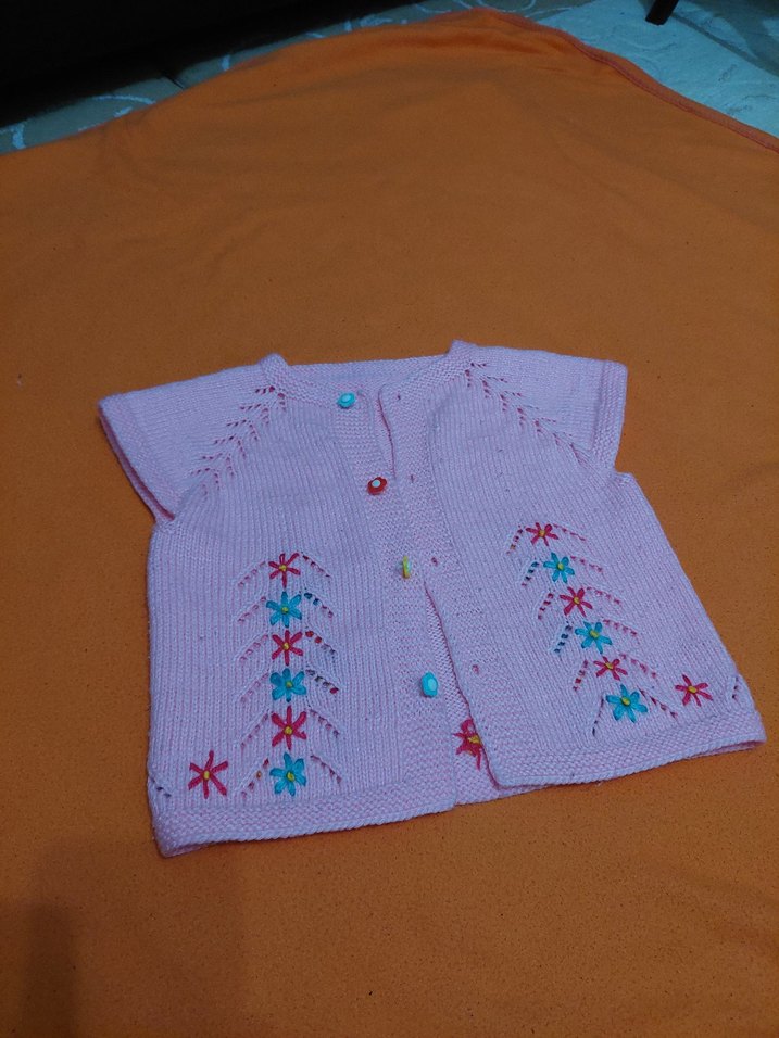 Pembe renkli, nakışlı çiçek desenleriyle süslenmiş, kolsuz triko yelek. Bol kesimi ve bohem tarzıyla dikkat çeker. tam rengi son fotoda