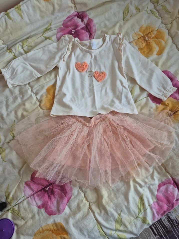 Nakışlı kalpli uzun kollu triko üst ve pastel pembe tül etekten oluşan, dantel detaylı, bol kesim kız çocuk takımı.