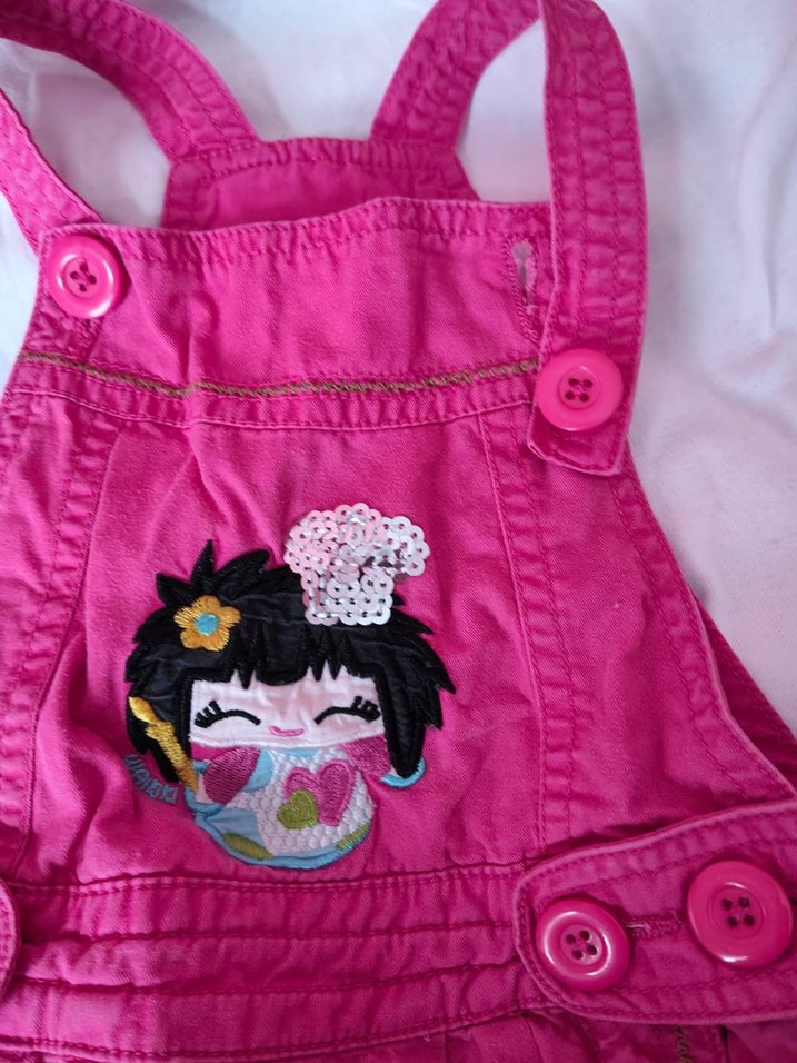 Renkli nakışlı pop kültür desenli, düğmeli askılı, pembe, kız çocuklarına uygun elbise. Tekstil kumaştan üretilmiştir. 3 yaş