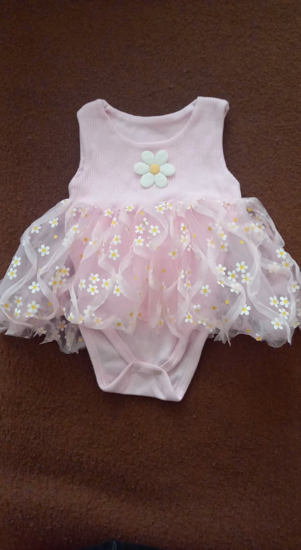 Pembe, kolsuz, straplez yakalı, nakışlı fırfırlı etekli, yumuşak sentetik kumaştan yapılmış kız bebek elbisesi.