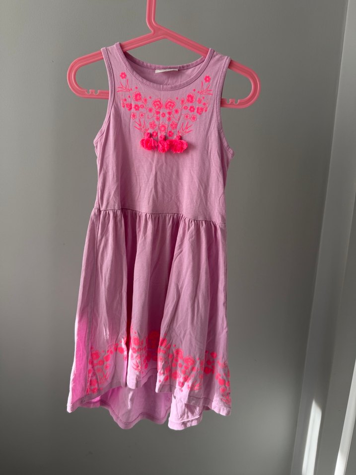 Pembe, kolsuz kız elbisesi, nakışlı çiçek desenleri ve fırfır detaylarına sahiptir. Bol kesim ve askısız yakaya sahiptir, yumuşak dokulu kumaştandır.