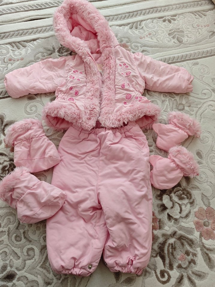 Kapüşonlu, kürklü detaylı, nakış işlemeli pastel pembe bebek kış tulumu. Eldiven ve patik setiyle birlikte. Amerikadan geldi