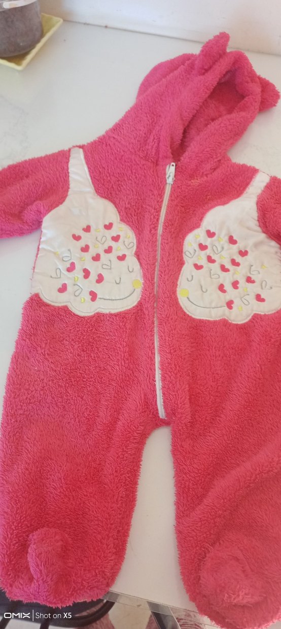 Yumuşak kürk dokusuyla pembe tulum, renkli nakış desenleri ve önden fermuar kapamalı. Ekstra sıcaklık için kapüşonlu tasarım.