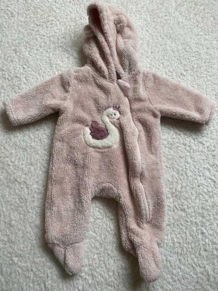 Bu pastel pembe bebek tulumu, kürklü detaylar ve nakışlı kuğu deseni ile kapüşonlu ve ayaklı tasarıma sahiptir. Çok az kullanıldı yeni gibidir.