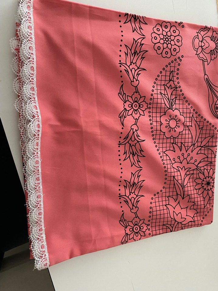 Pembe renkte, renkli nakışlı çiçek desenleri ve ince dantel kenarlarıyla geleneksel bir masa örtüsüdür.