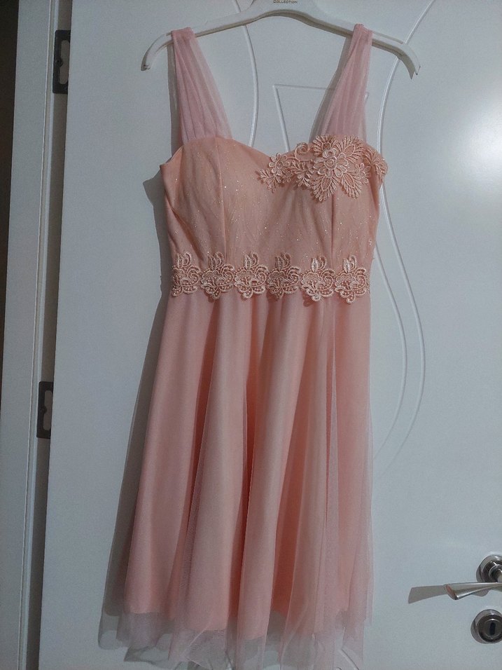 İnce askılı, dantel nakış detaylı, pastel pembe midi boy abiye elbise. Straplez yakalı ve kolsuz tasarıma sahiptir.