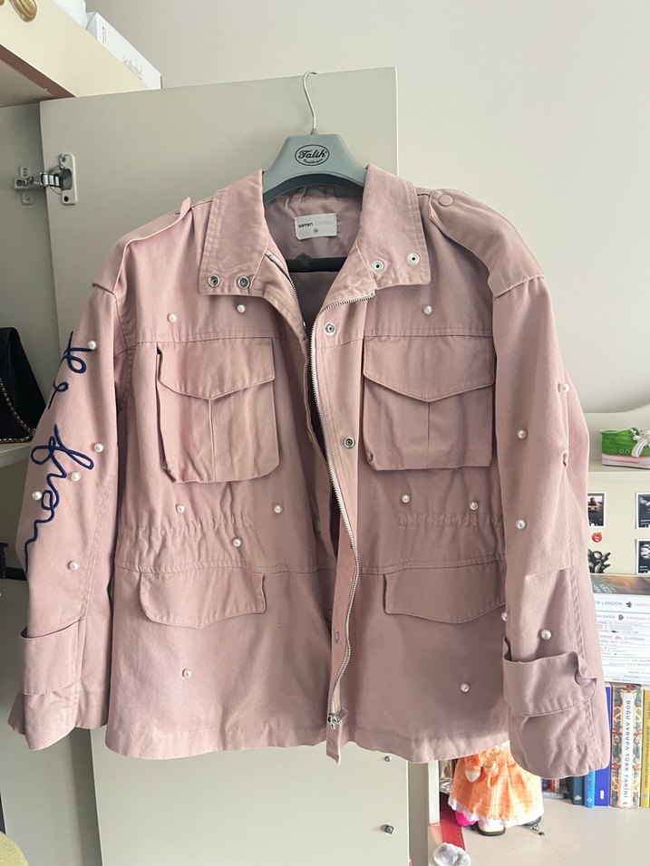 Düğmeli, yakalı ve nakış detaylı pembe midi uzunlukta bol kesim kadın ceket. Günlük sokak stili için uygun, uzun kollu.