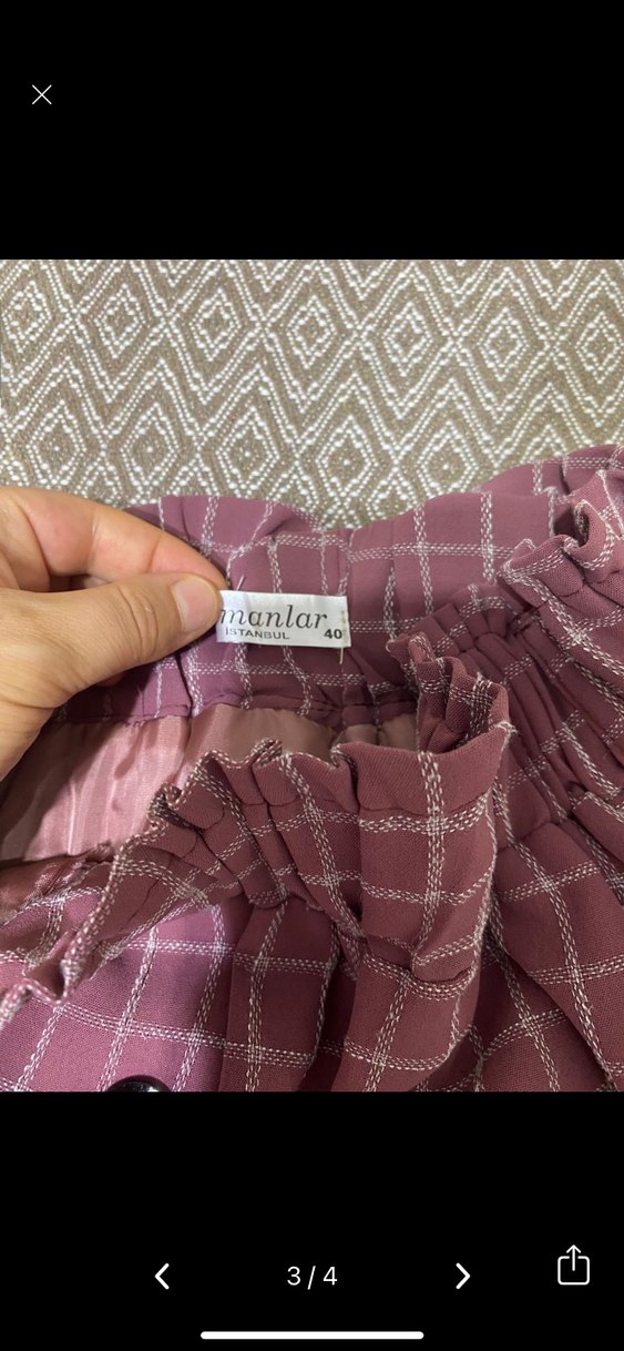 Pembe pastel tonlarında, nakışlı ve fırfırlı midi uzunlukta, bol kesim kadın kumaş pantolon. Yumuşak sentetik kumaştan üretilmiştir, günlük kullanıma uygundur. Beden 40.