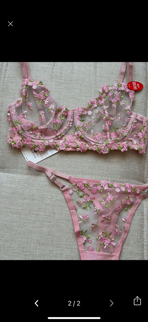 Pastel pembe renkte, kısa boylu, çiçek nakışlı mini sütyen ve külot takımı. Bohem ve Paris tarzını yansıtan şeffaf kumaşla romantik bir görünüm sağlıyor.