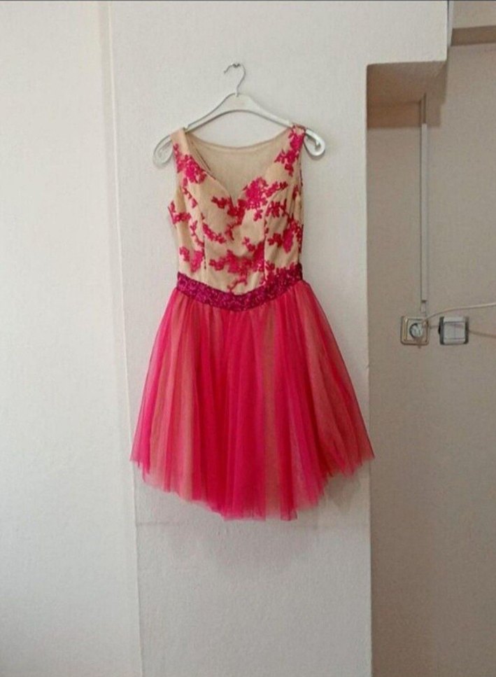 Pembe Nakışlı Mini Dantel Abiye Elbise