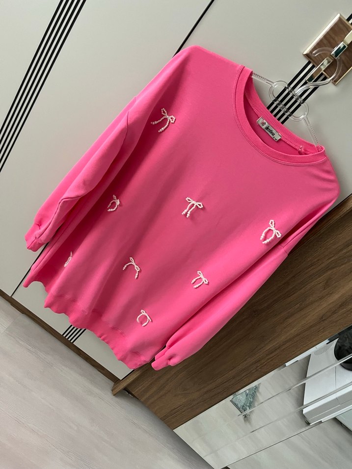 Pembe ve yeşil 2adet renkli, uzun kollu, bisiklet yaka ve bol kesim mini sweatshirt. Nakışlı fiyonk detaylı SM beden