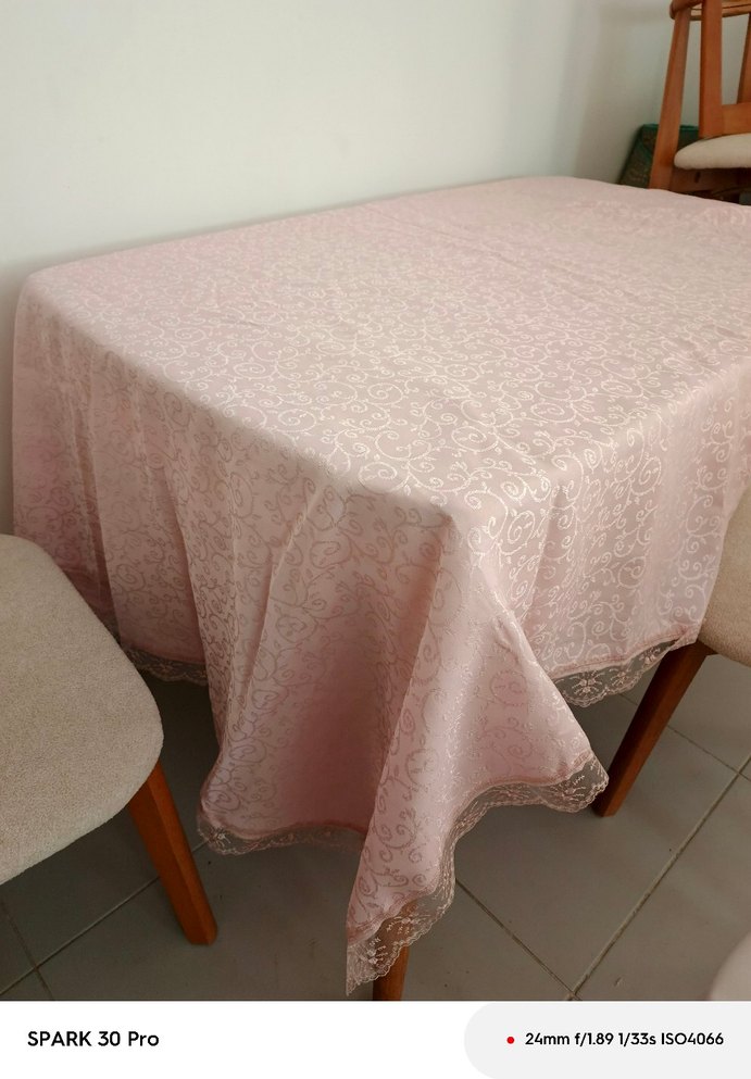 Pembe pastel tonlarında, nakışlı desenli modern klasik tarzda masa örtüsü, şık ve zarif bir görünüm sunar.