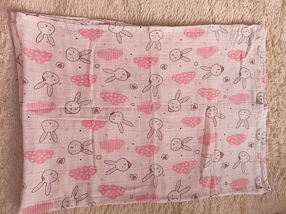 Pastel pembe renkte, nakışlı tavşan ve bulut desenlerine sahip pamuk çocuk battaniyesi. Yumuşak ve konforlu.