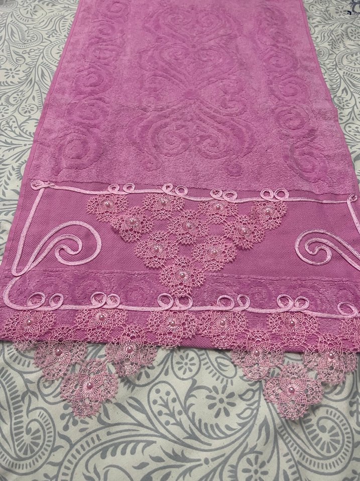 Pembe renkli, nakış ve dantel detaylı, klasik tarzda renkli desenlere sahip havlu.