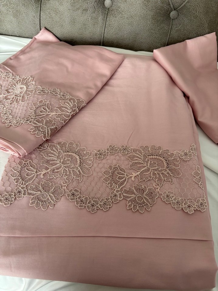 Pastel pembe renkte, kenarlarında zarif nakışlı çiçek desenleri bulunan nevresim ve çarşaf takımıdır. Yumuşak kumaşıyla rahatlık ve şıklık sunar.