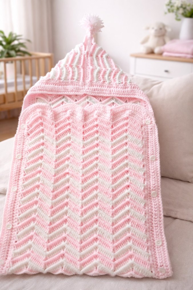 Nakışlı desenlere ve ponponlu kapüşona sahip pastel pembe örgü bebek battaniyesi, çocuklar için sıcak ve rahat bir seçenek sunar.