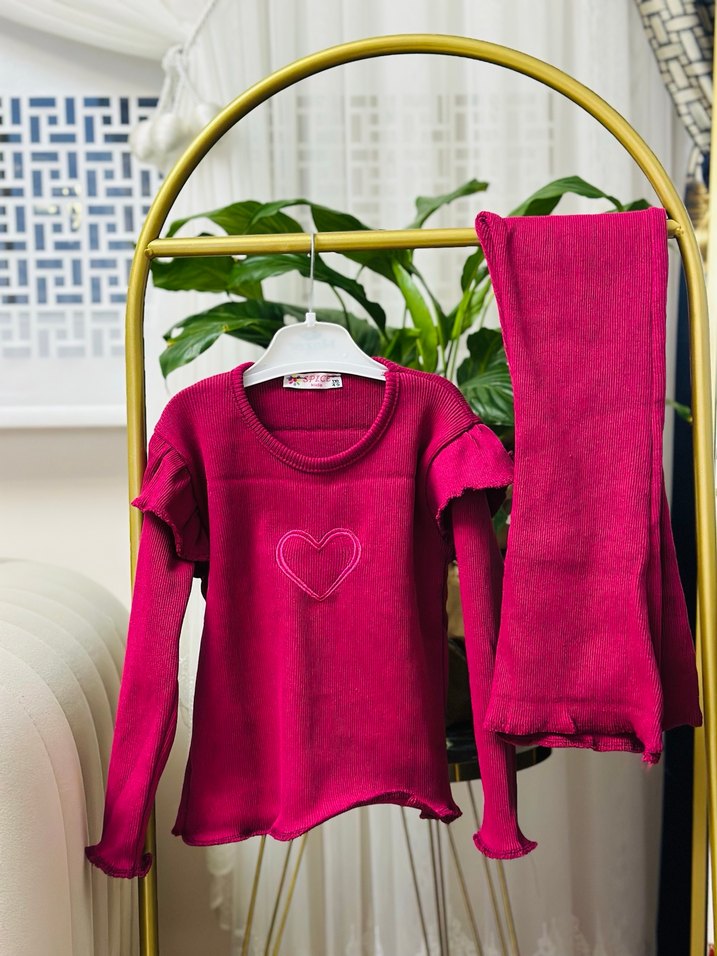 Uzun kollu, yumuşak örgü kumaştan yapılmış pembe renkli bebek kız takımı. Nakışlı kalp deseni ile renkli ve rahat bir görünüm sunar.