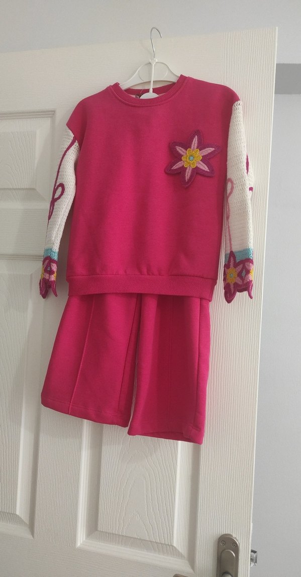 Örgü uzun kollu üst, renkli nakışlı çiçek desenleri ve uyumlu pembe pantolondan oluşan bebek kız takımı.içi şardonlu takım 3_4 yaş